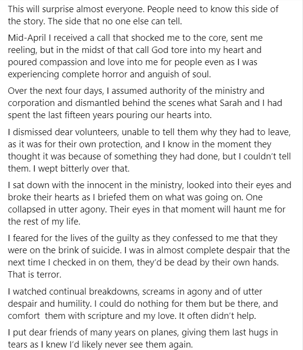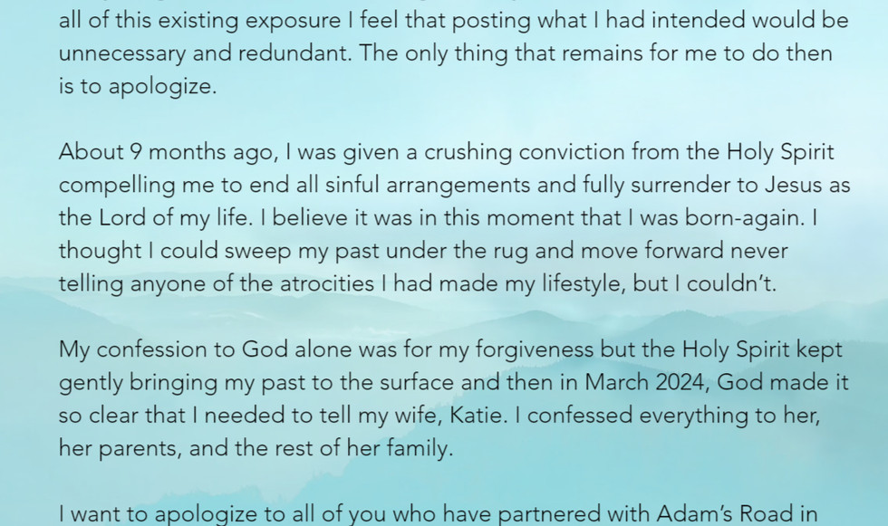 Micah's confession, while melodramatic and blatantly manipulative, didn’t provide an account of what happened. After a few weeks, some of the wording was changed and significant sentences were removed. This, I would argue, may have been to downplay and distance Micah from the reality and severity of his behavior. Shortly after making these revisions, however, the confession was taken down, and so was the entire Adam’s Road Ministry website.