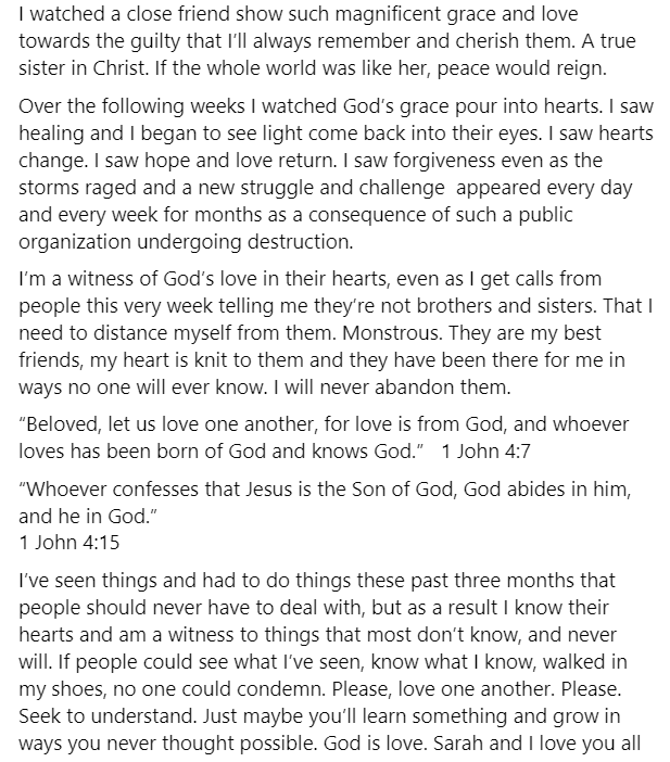 After 18 years of deception, corruption, and exploitation, Micah’s estranged family and the rest of the Christian Church are left to grieve and suffer the destruction left in the wake of this scandal. Meanwhile, he and those who support him simply wish to “...live quiet lives and heal…” But it isn’t Micah and those who support him who need to rebuild their lives and heal. They are not the victims.