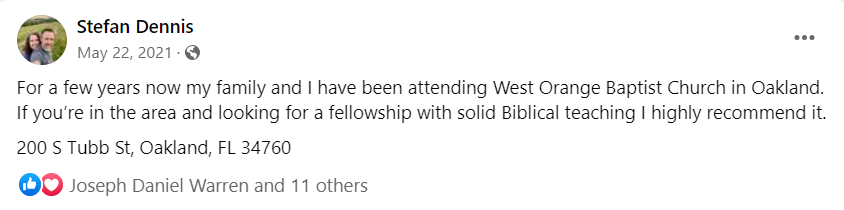 “...Just wanted to let you know that none of the Adam’s Road members involved in those sinful activities were ever members of First Baptist Church of Winter Garden. Micah Wilder’s kids and Stefan Dennis’ kids attended Foundation Academy. That’s it…